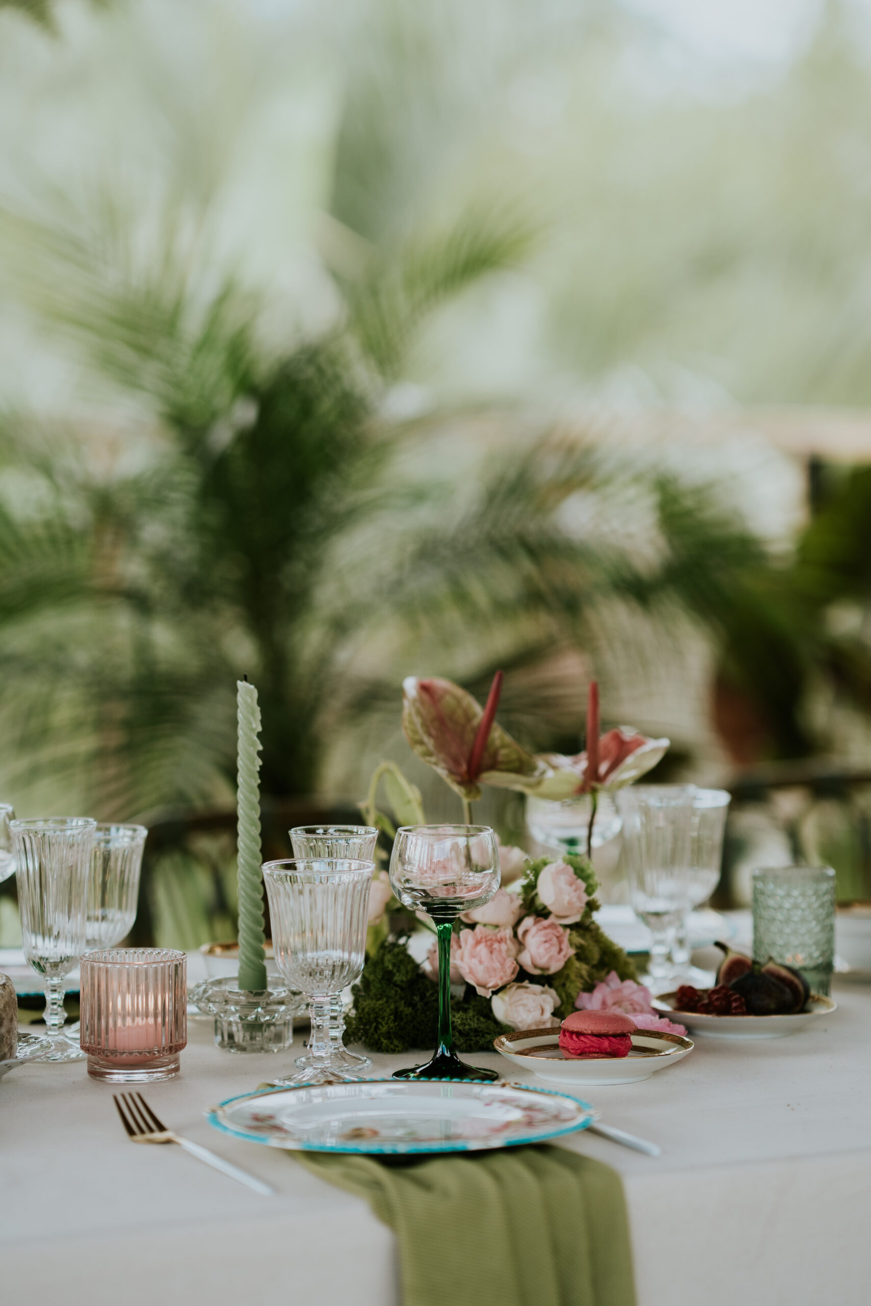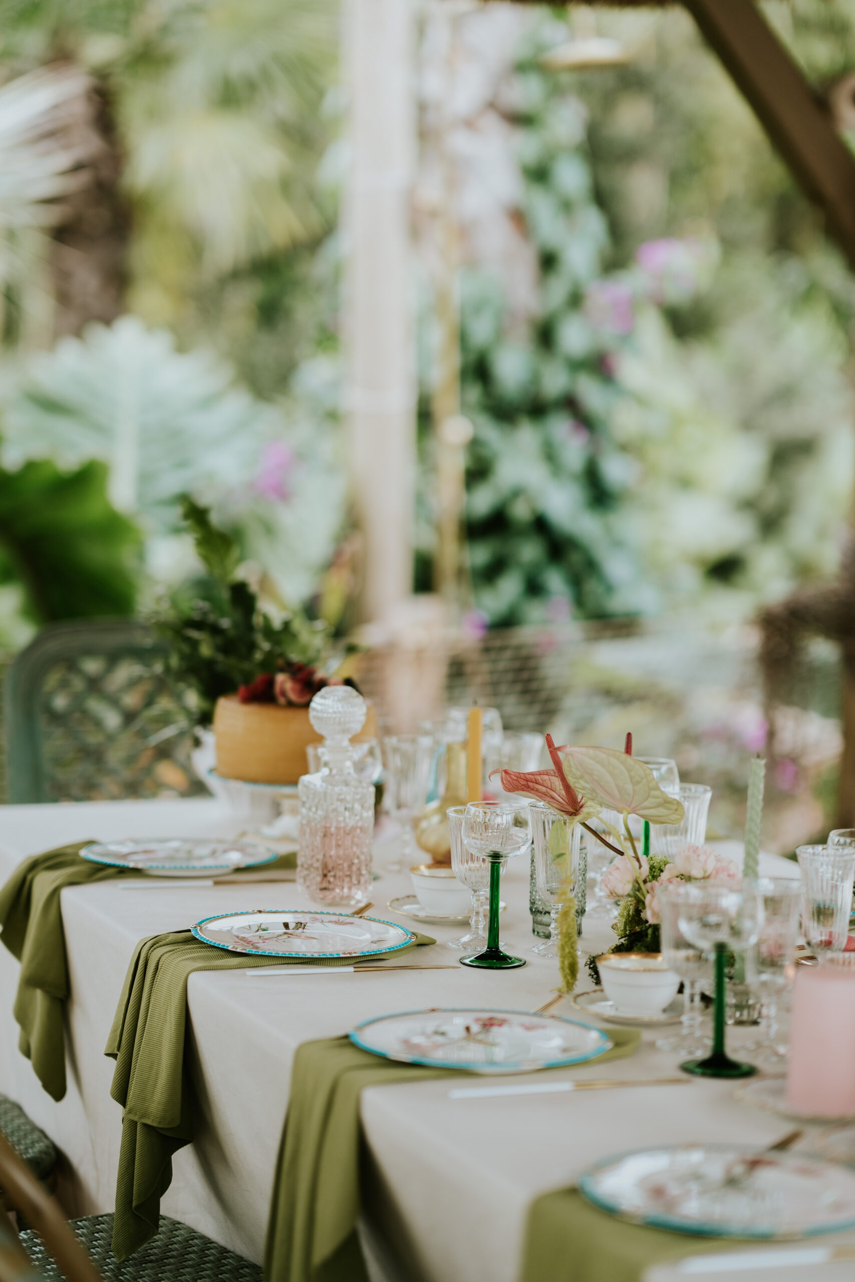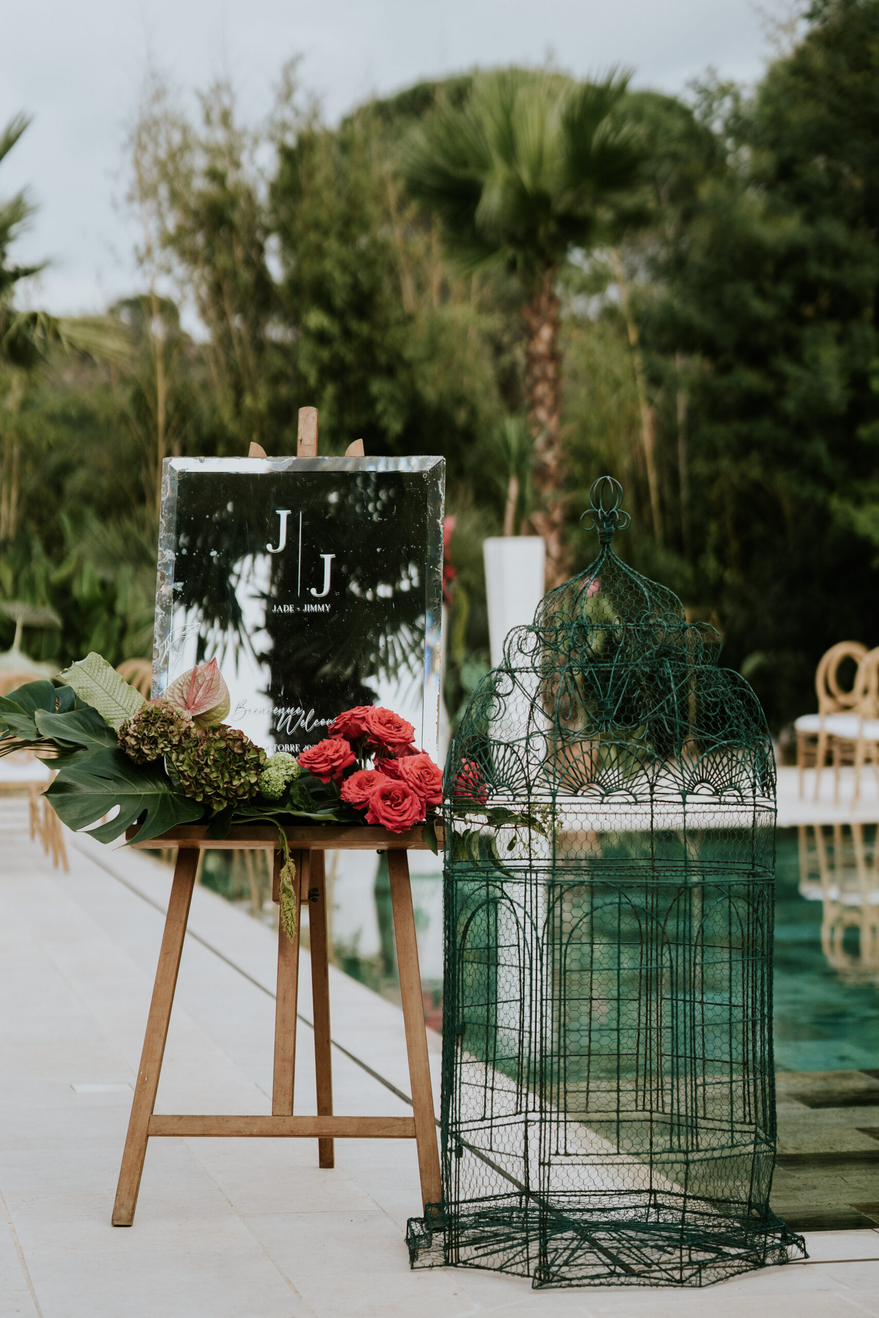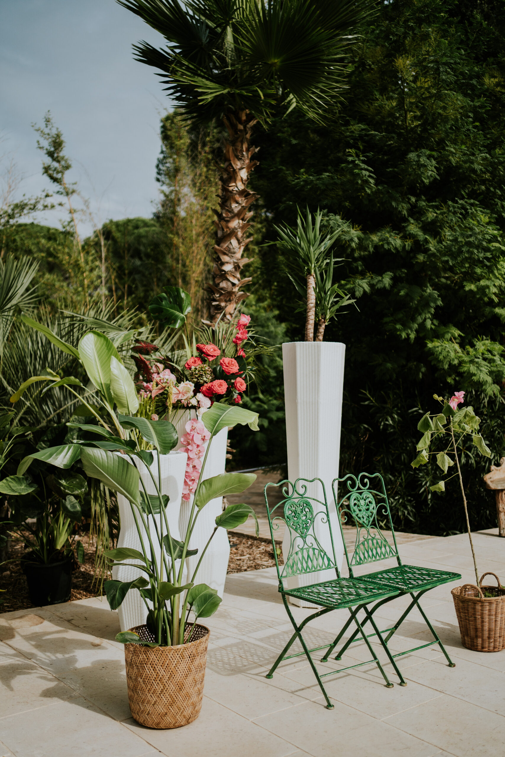 Du vert, du fushia et les nouveautés au catalogue 2025 ont été mises en scène dans ce décor magique : cage à oiseaux vintage, desserte, bar à fleurs , chaises en fer forgé vertes pour la cérémonie, maxi vases en Résine blanc, nappes et art de la table !