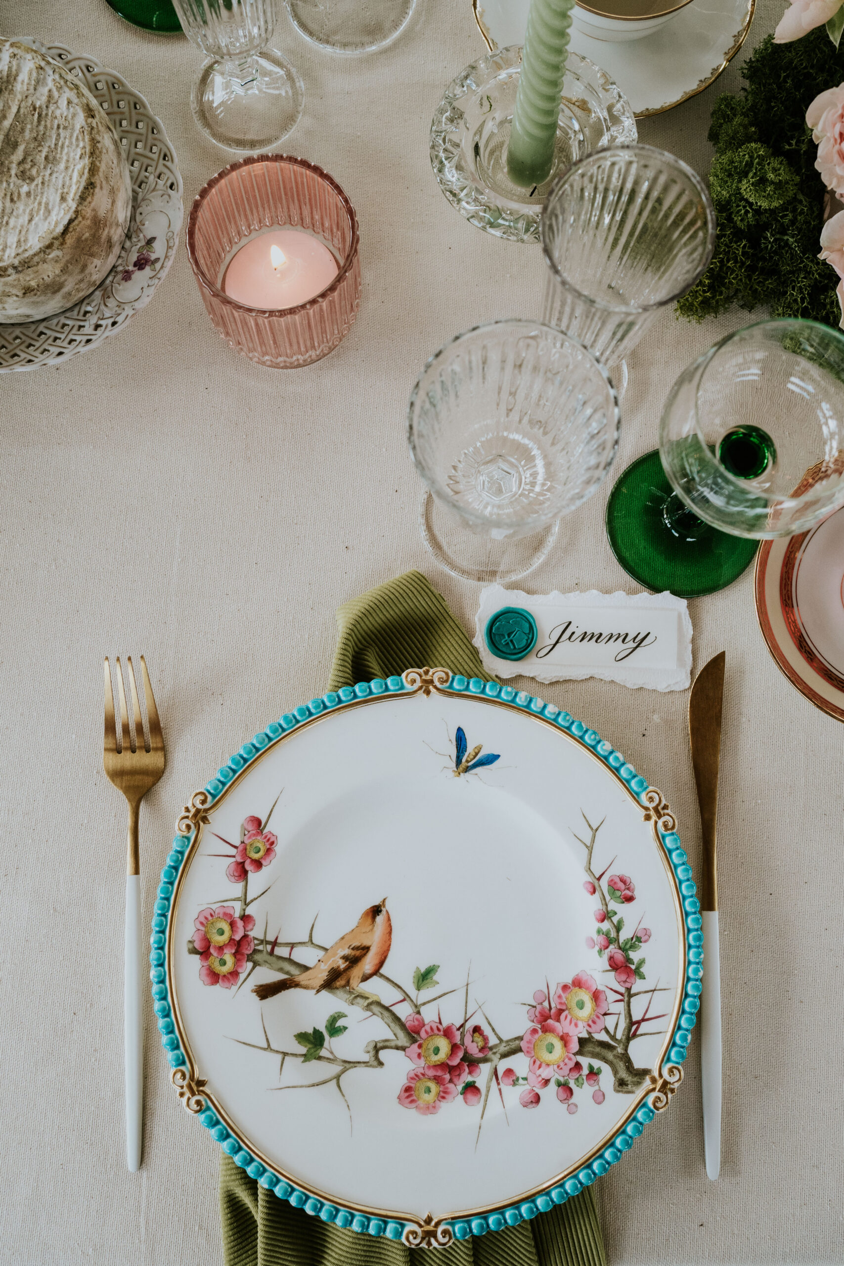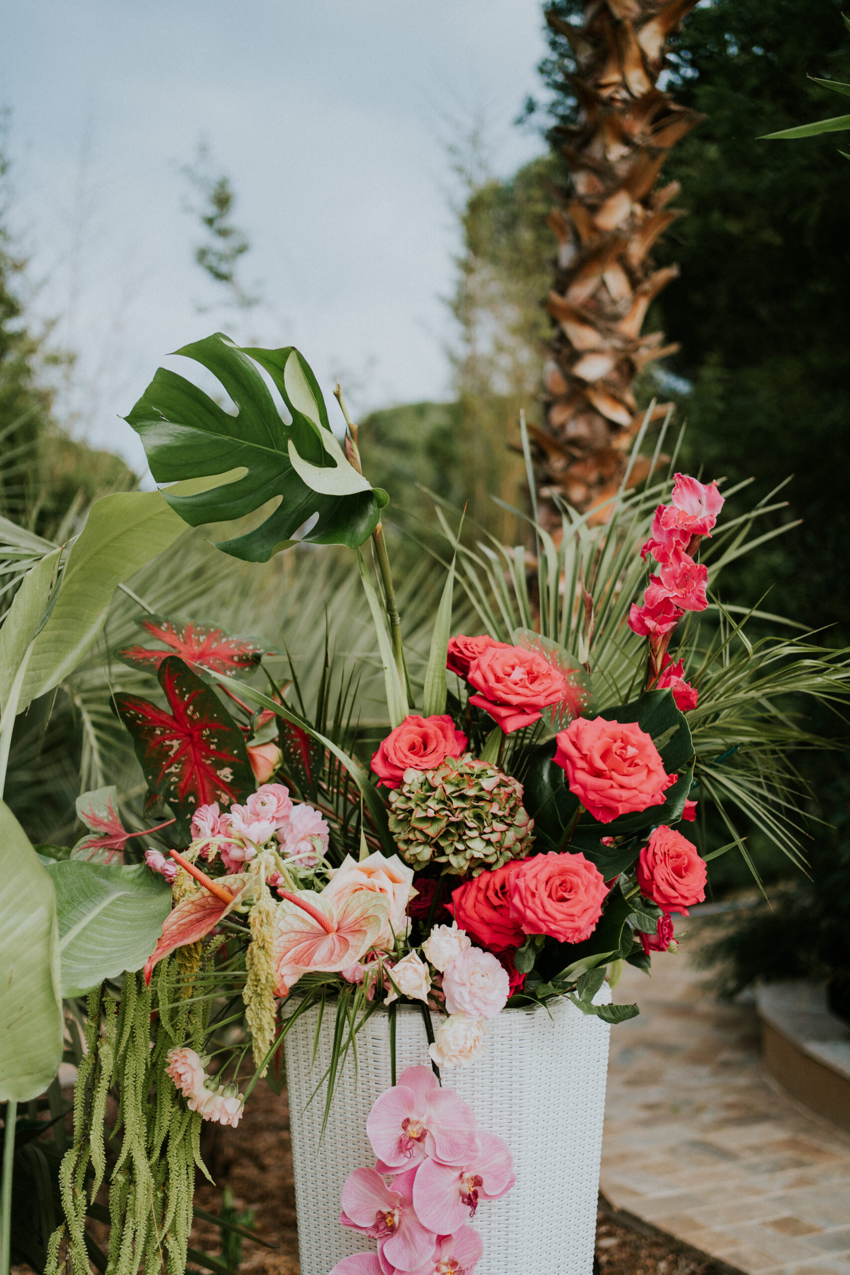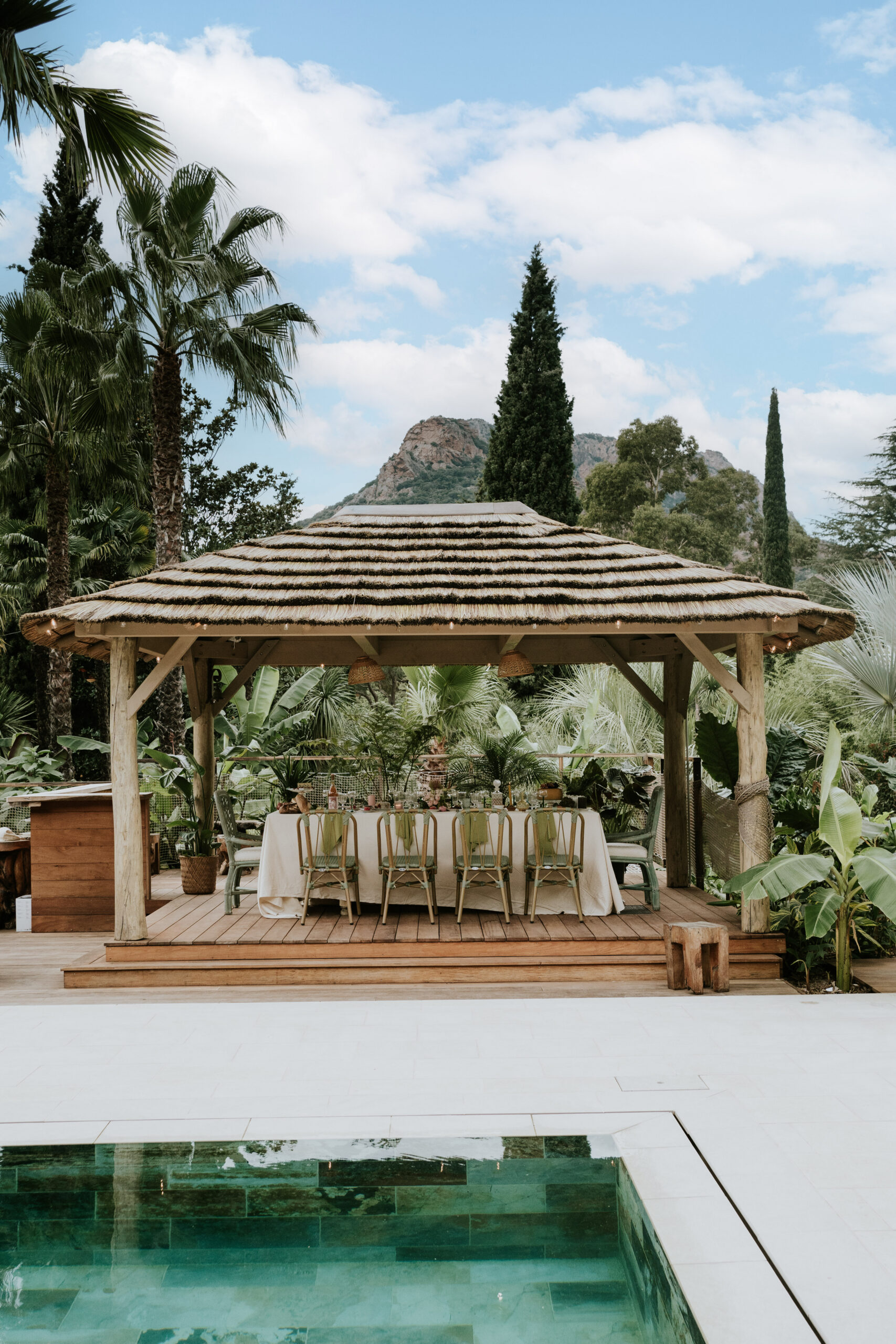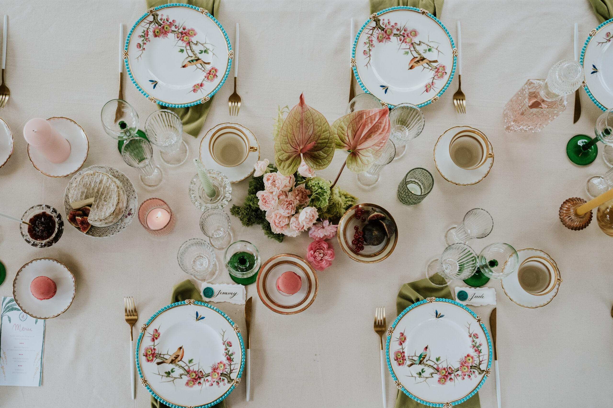 Du vert, du fushia et les nouveautés au catalogue 2025 ont été mises en scène dans ce décor magique : cage à oiseaux vintage, desserte, bar à fleurs , chaises en fer forgé vertes pour la cérémonie, maxi vases en Résine blanc, nappes et art de la table !
